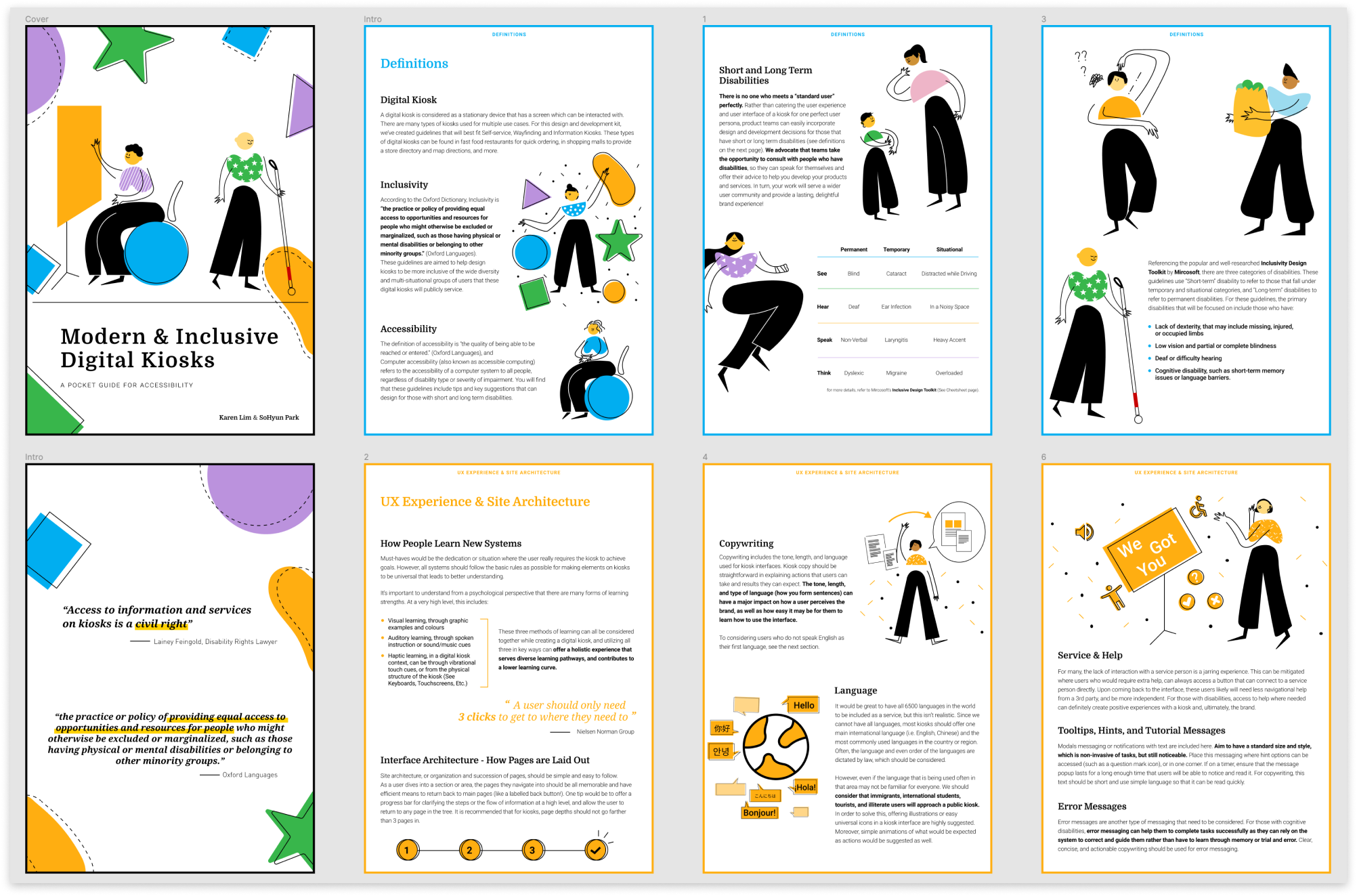 “Modern & Inclusive Digital Kiosks” introduces a holistic understanding of accessibility and inclusivity, and provides a set of guidelines that dives into how one may develop and design digital kiosks. The resulting work is a compendium of research and best practices that are being concurrently developed in UX/UI Design and Technology focused companies, organizations, and academic institutions globally.